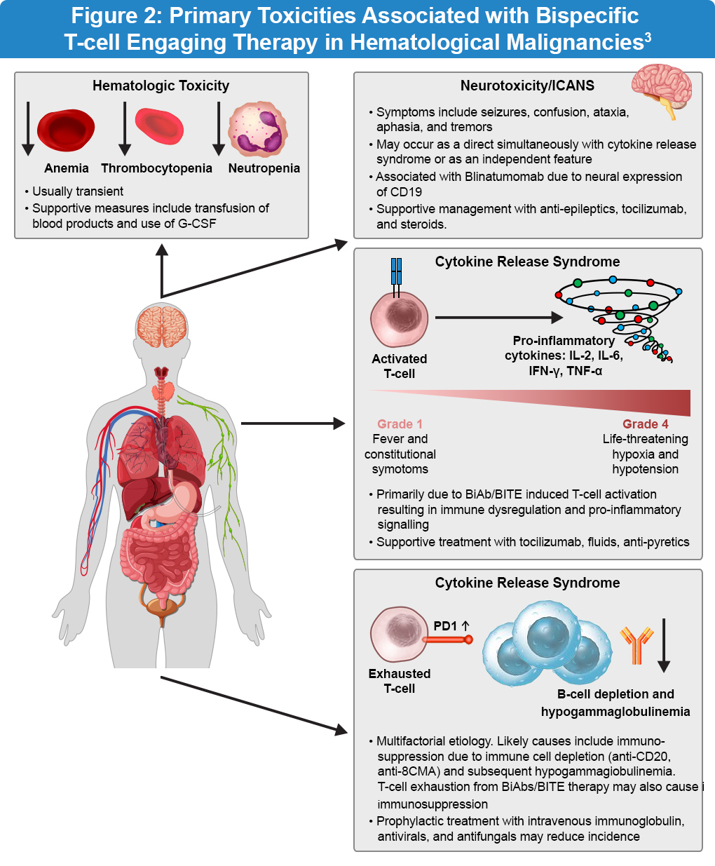 The key adverse events associated with bispecific antibody therapy are cytokine release syndrome (CRS), neurotoxicity, infections, and tumor lysis syndrome (Figure 2). CRS is characterized by an exaggerated inflammatory response with elevated levels of cytokines, including interleukin-2 (IL-2), interleukin-6 (IL-6), interferon-gamma (IFN-γ), and tumor necrosis factor-alpha (TNF-α). The clinical symptoms of CRS range from mild fever and malaise to severe hypotension and hypoxia. In the ELM-1 and ELM-2 clinical studies, a modified step-up dose regimen demonstrated a favorable safety profile. The safety profile was generally consistent with earlier reports and CRS events were predominantly low grade and manageable. Importantly, continued treatment with odronextamab showed no detrimental effects on patient-reported outcomes.4