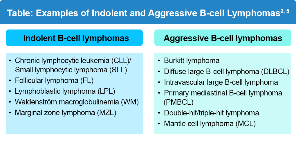 NHLs are also classified as indolent, meaning it grows and spreads slowly, or aggressive, meaning it grows and spreads quickly. Indolent lymphomas may have few signs or symptoms, whereas symptoms may be severe with aggressive types.2 And while both types are equally common among adults, children are more prone to aggressive NHL.2 Some types of NHL have both indolent and aggressive characteristics, for example, mantle cell lymphoma.1