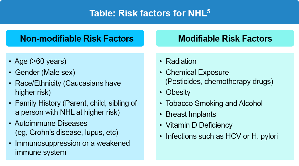 NHL can be categorized in different types based on factors, such as type of lymphocyte it developed from, as well as how it grows and spreads.2 These factors can affect experienced symptoms, time to diagnosis, possible treatment options, and overall survival.2 Affected lymph nodes located next to each other, and NHL that is new or that has returned after treatment (recurrent) can impact treatment as well.2